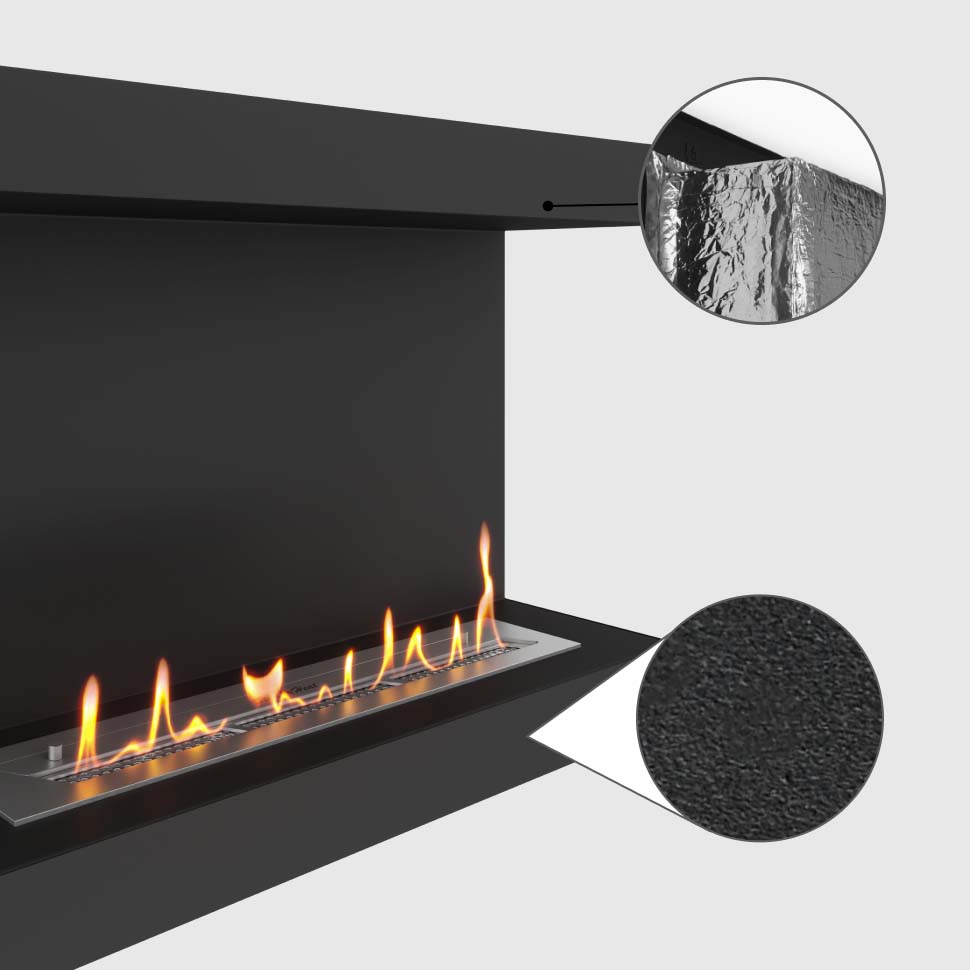 Очаг биокамина покрыт огнеупорной порошковой краской. При необходимости рекомендуем покрыть обратную часть очага теплоизоляцией!