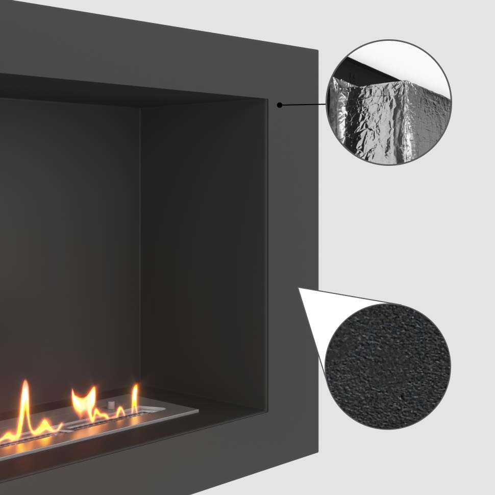 Очаг биокамина покрыт огнеупорной порошковой краской. При необходимости рекомендуем покрыть обратную часть очага теплоизоляцией!